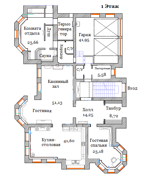 1 этаж: Гараж на 2 машины, холл, гостиная-каминный зал, кухня-столовая, гостевая комната, с/у гостевой, сауна, комната отдыха, с/у (душ), котельная, хоз. блок..