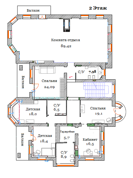 2 этаж: 3 балкона, 5 спален, 3 с/у совм, гардеробная, огромная комната отдыха 90м ( м.б. спортзал, бильярдная).